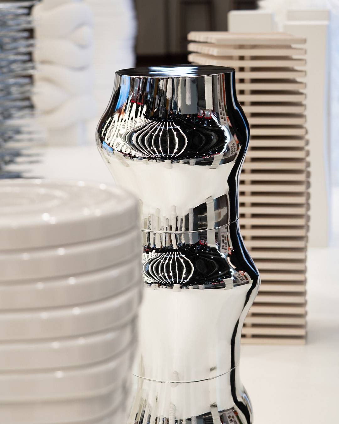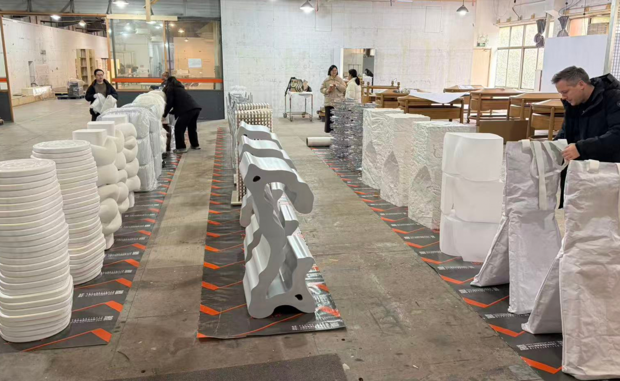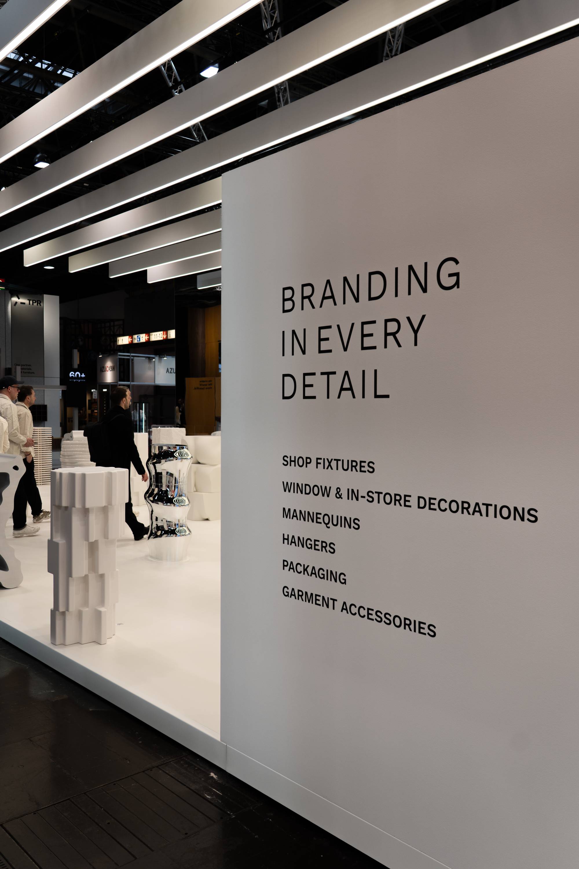 One example was a sculptural podium constructed from 137 metal hangers, weighing around 100 kilos. It had to be welded without warping and fixed invisibly into the floor -illustrating the level of detail and precision involved throughout the project.